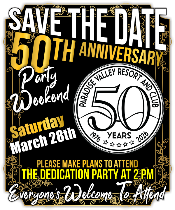 | Like all clubs, organizations and communities, everyone is welcome unless you do something wrong or break the simple to follow rules. Paradise Valley Resort & Club is a private club and memberships can and will be terminated for failure to follow our simple Valley Code of Conduct. Please visit, enjoy, become a member and part of the Valley Family. Please be advised that purchasing a Home, Condo, RV Site or leasing a place of your own at Paradise Valley does not give you automatic access to the club. Paradise Valley Resort & Club is a private membership club. |